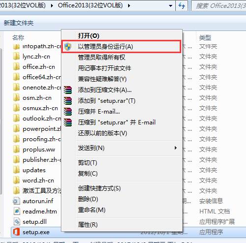 5、打開文件夾“Office2013(VOL版)”,找到里面的“setup.exe”,右擊—以管理員身份運行。