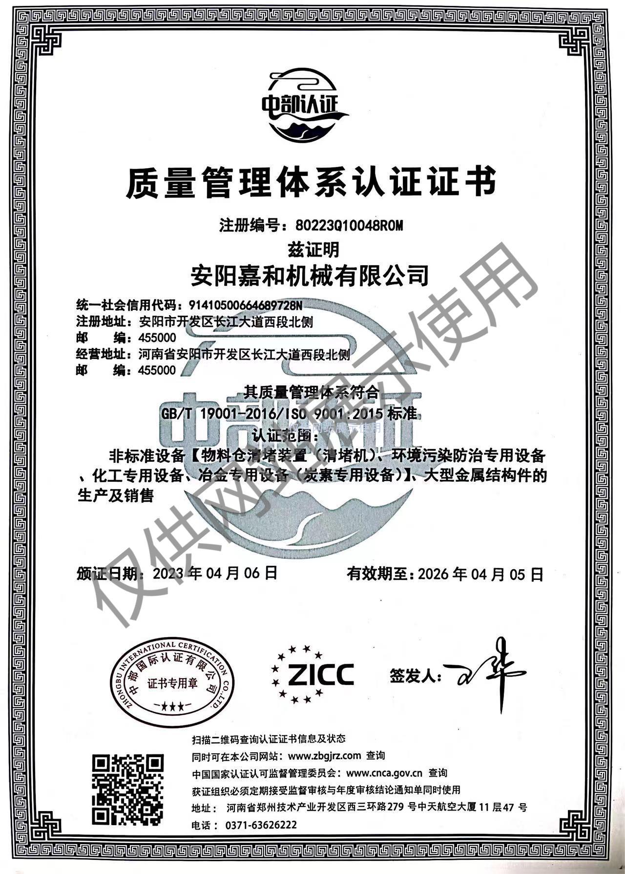 質量管理體系認證證書